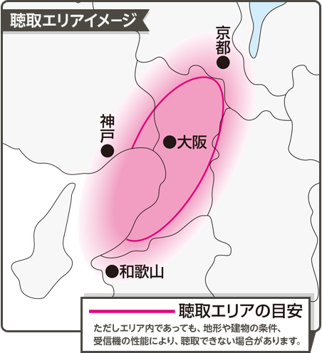 大阪府高石市の送信所から近畿広域圏に放送しています。AM放送は電波が広範囲に届くメリットがある一方で、例えば鉄筋コンクリートの建物の中には電波が届きにくい、パソコンなどの電子機器の近くでは雑音が入りやすい、といったデメリットがあります。