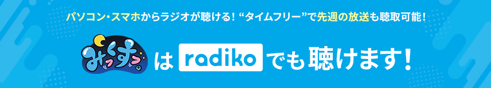 「みっくすっ。」は色々なジャンルを「MIX」。「くすっ」と笑える番組を目指し、毎週月曜から木曜、深夜25時から1時間、ABCラジオから生放送でお送りします。