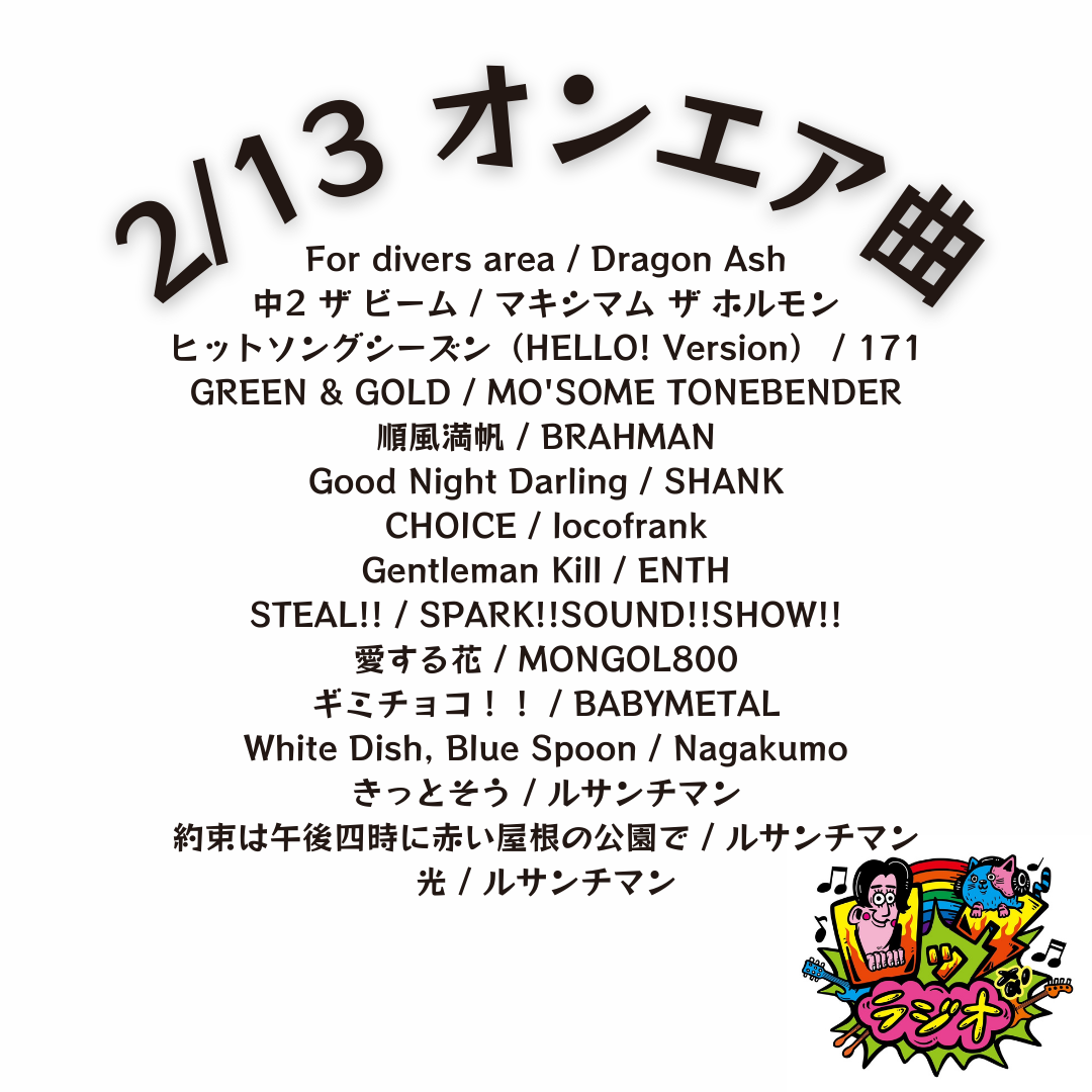 番組TOPオンエア曲番組概要ライブハウスからラジオスタジオへ!?金曜夜に桜井雅斗が新旧ロックナンバーと共に駆け抜ける115分間!出演者 桜井 雅斗コーナー紹介「あつまれ!ハッピーピーポー」金曜夜の関西の街を盛上げる「ハッピーピーポー」達に電話を繋いで街の様子をレポートしてもらいます。オンエア曲2026年02月13日2/13 オンエア曲一覧を見る関連リンク公式X番組へのお便りメールrock@abc1008.comメールフォーム他のおすすめ番組バラエティ昼の番組ドライブで聴きたい岩本・西森の金曜日のパパたち金 15:00-17:40番組ページバラエティ夜の番組サクッと聴きたいほたるまち発 ひろし・あさおのタビラジ!月 18:30-19:00番組ページバラエティ夜の番組気分転換したい織田信成と高野純一のぽくない火曜日火 19:15-21:00番組ページ