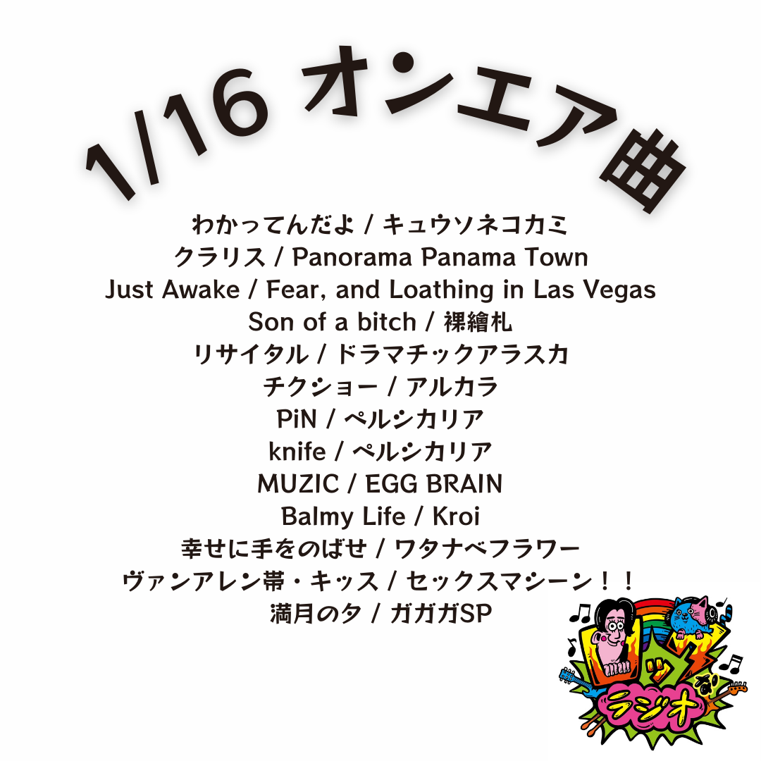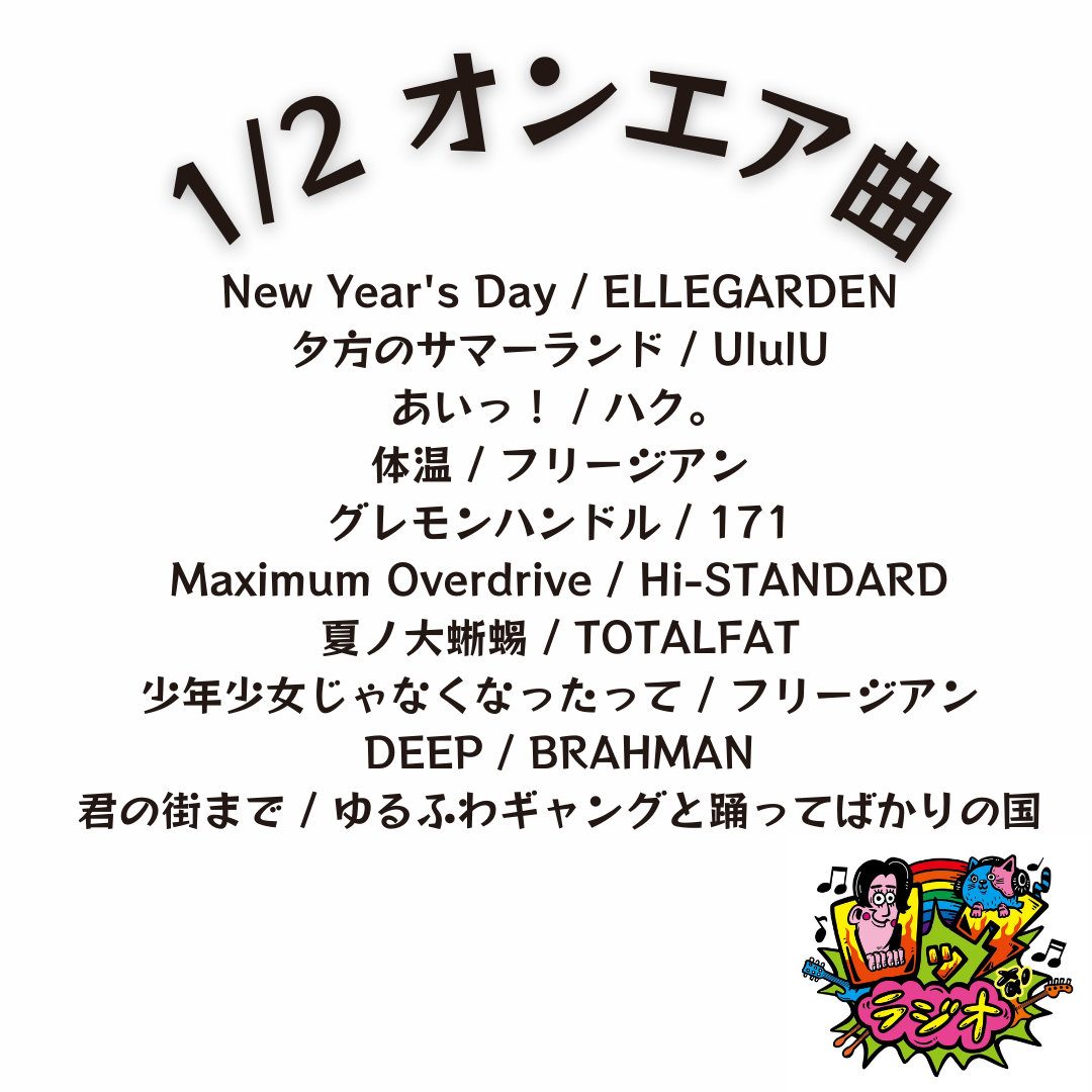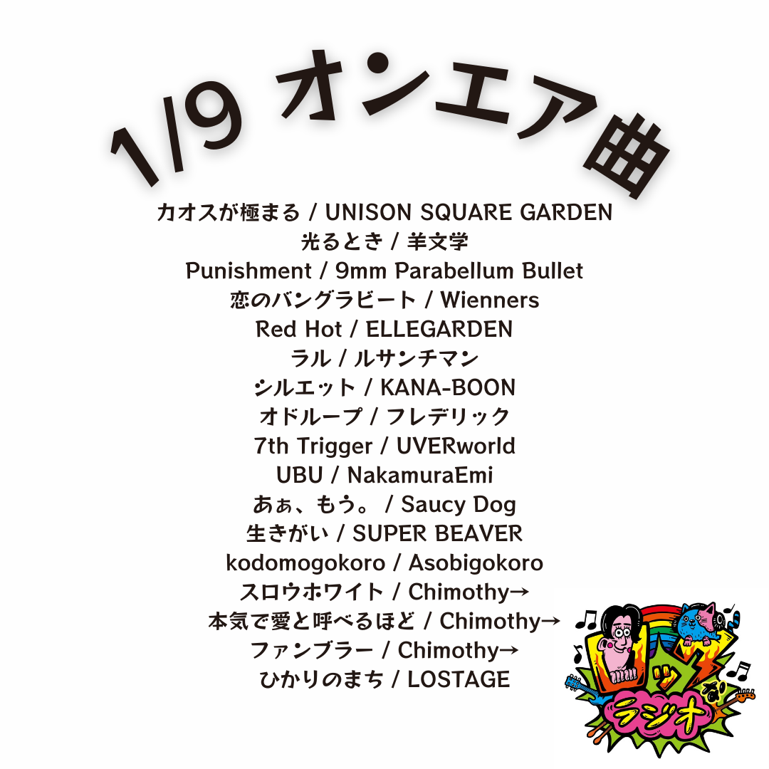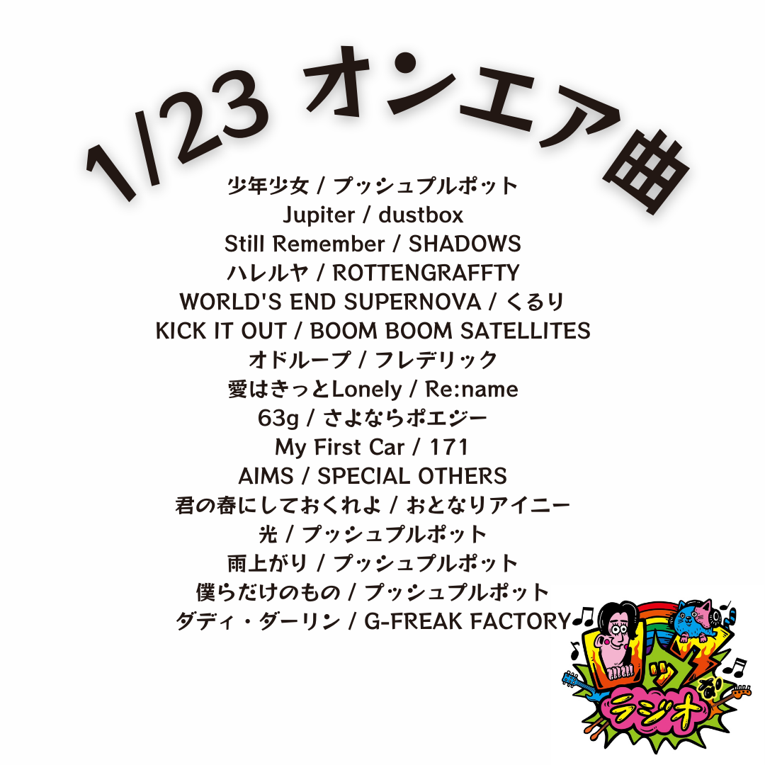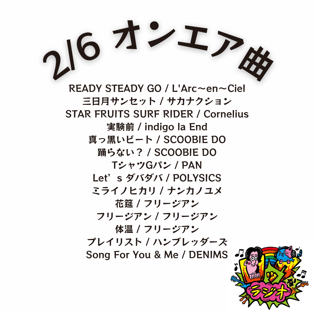 番組TOPオンエア曲オンエア曲2026年2026.02.132/13 オンエア曲2026.02.062/6 オンエア曲2026.01.301/30 オンエア曲2026.01.231/23 オンエア曲2026.01.161/16 オンエア曲2026.01.091/9 オンエア曲2026.01.021/2 オンエア曲